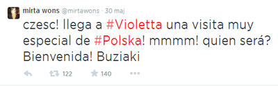 Tłumaczenie: " Cześć! Przychodzi do #Violetta bardzo szczególna wizyta z #Polski ! Mmmm! Kim będzie? Witam! Buziaki "