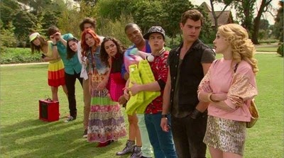 Następne zdjęcie prezentuje nam obsadę stojącą w szeregu. Byc może idą planować urodziny Violi.